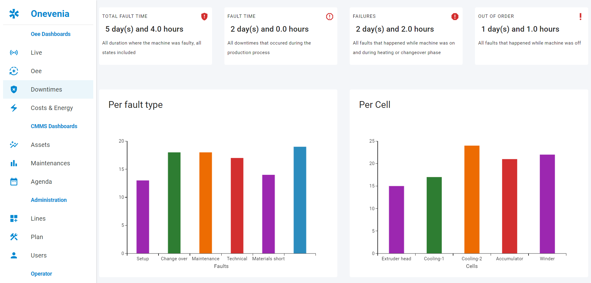 Track all your downtimes, when they happened, how long, why and where it happened. The software then uses this data, to calculate key metrics, and hilights all faults of each cell of your production line
